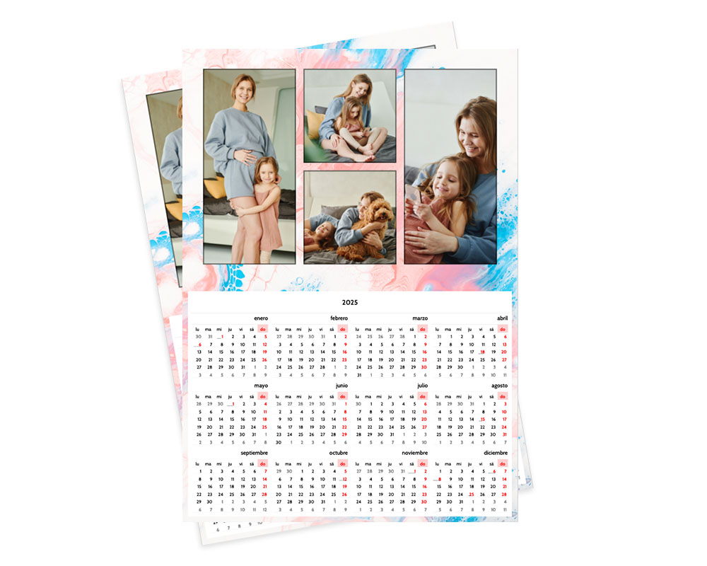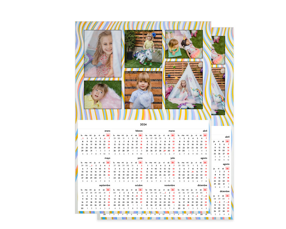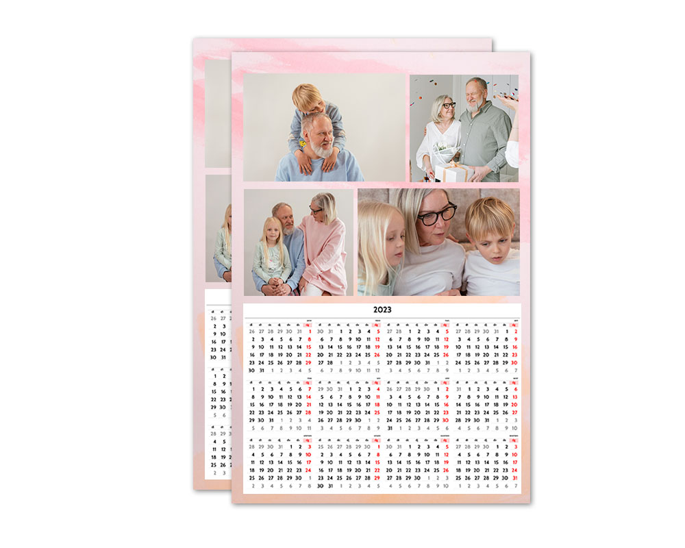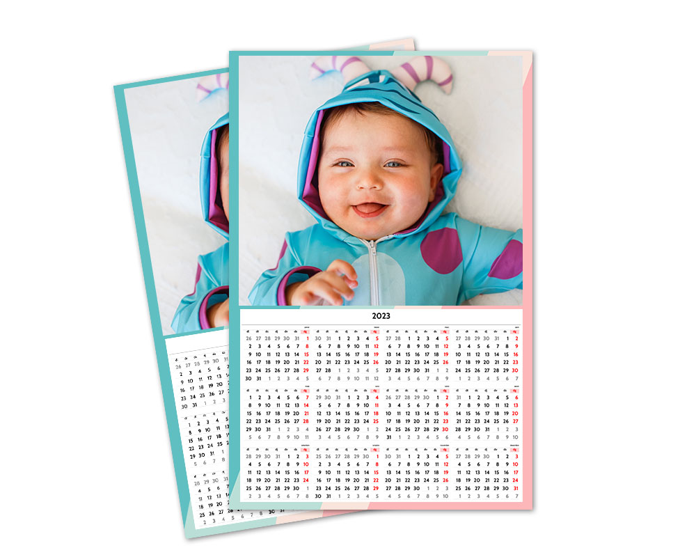 El calendario poster es un calendario de pared en formato Poster. Lo puedes personalizar con tus fotos favoritas usando nuestros diseños prediterminados. El calendario poster se imprime en papel gloss a una cara.