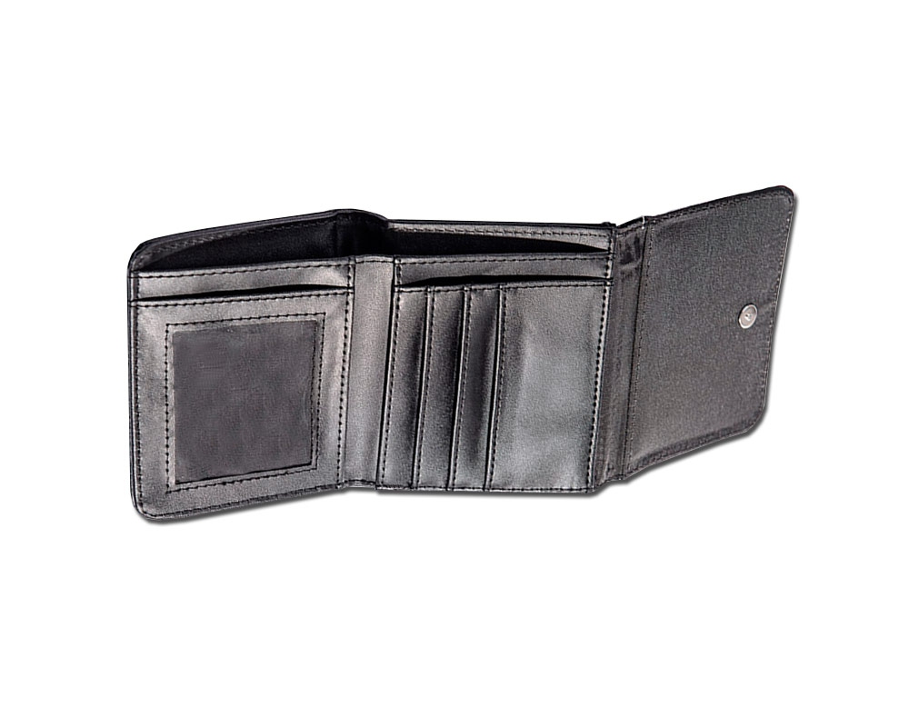 La cartera personalizada Estandard hecha de polipiel de 11 x 9 cm con un billetero y varios espacios para las tarjetas. La solapa personalizada de la cartera se cierre mediante clic. Disponible en dos colores: negro y marrón.